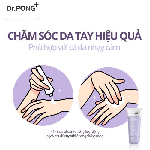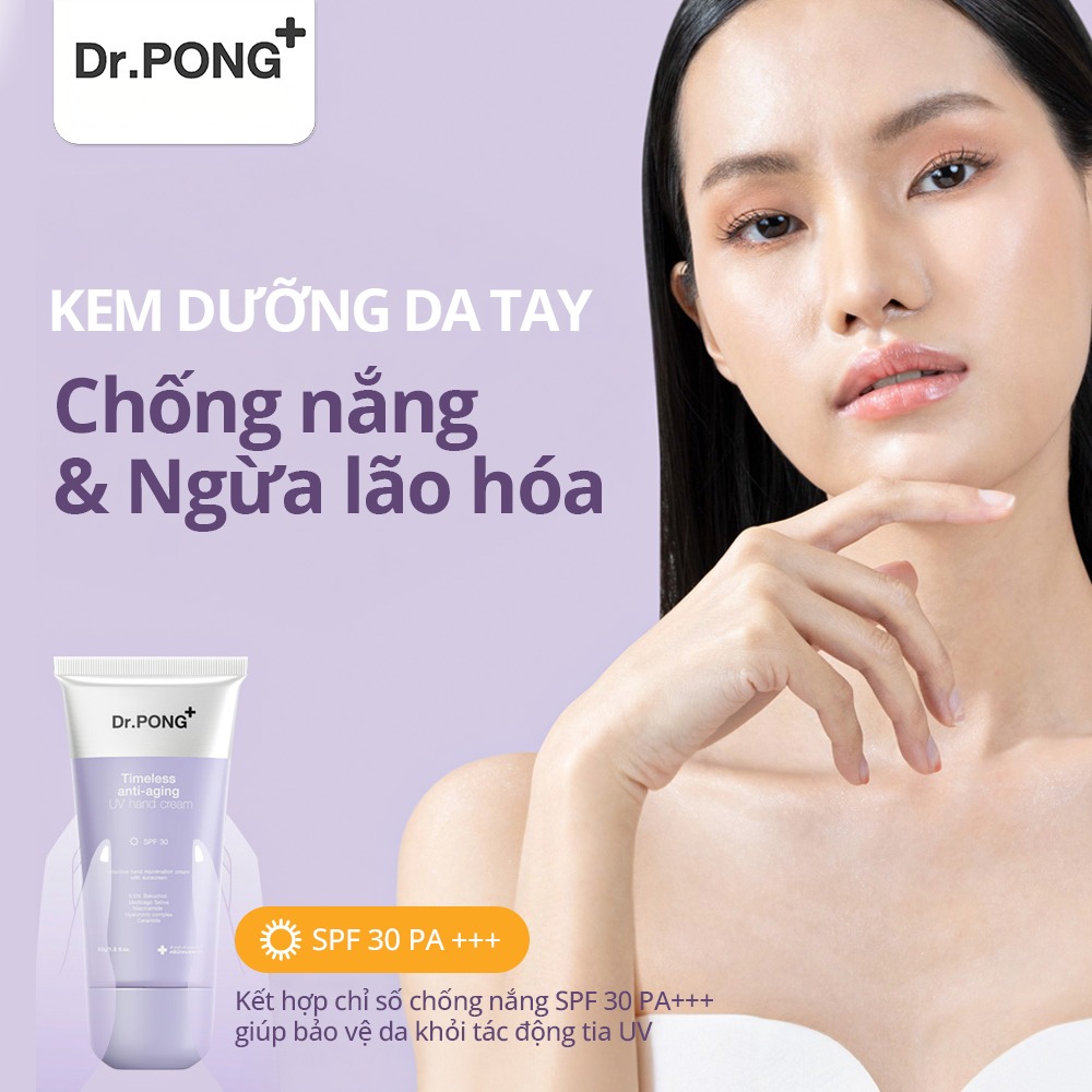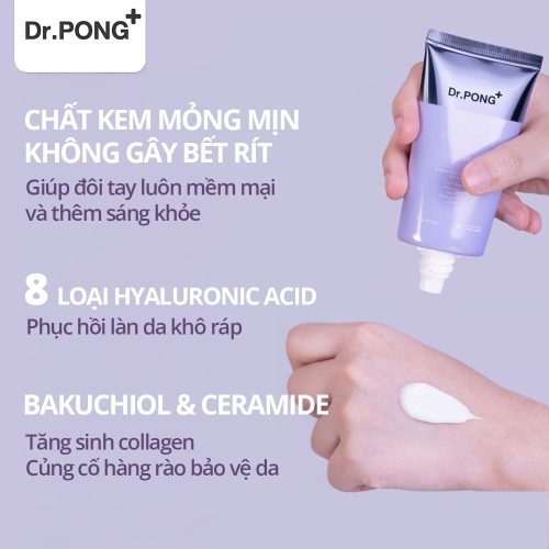 Kem dưỡng da tay Dr.PONG là giải pháp chăm sóc da tay hiệu quả với công dụng đa năng giúp nuôi dưỡng, làm mờ nếp nhăn và cải thiện độ đều màu cho vùng da tay thường xuyên tiếp xúc với ánh nắng. Sản phẩm kết hợp chỉ số chống nắng SPF30 PA+++ giúp bảo vệ da khỏi tác động tia UV, đồng thời ngăn ngừa lão hoá sớm, dưỡng ẩm sâu, giúp đôi bàn tay trở nên mềm mại, sáng khỏe hơn.